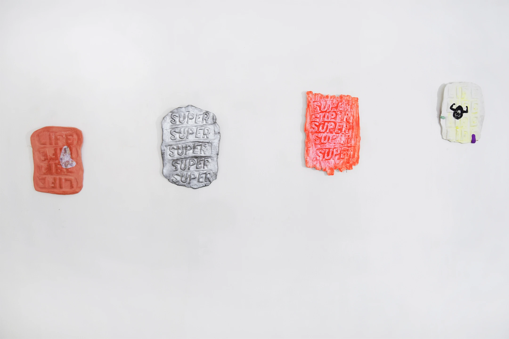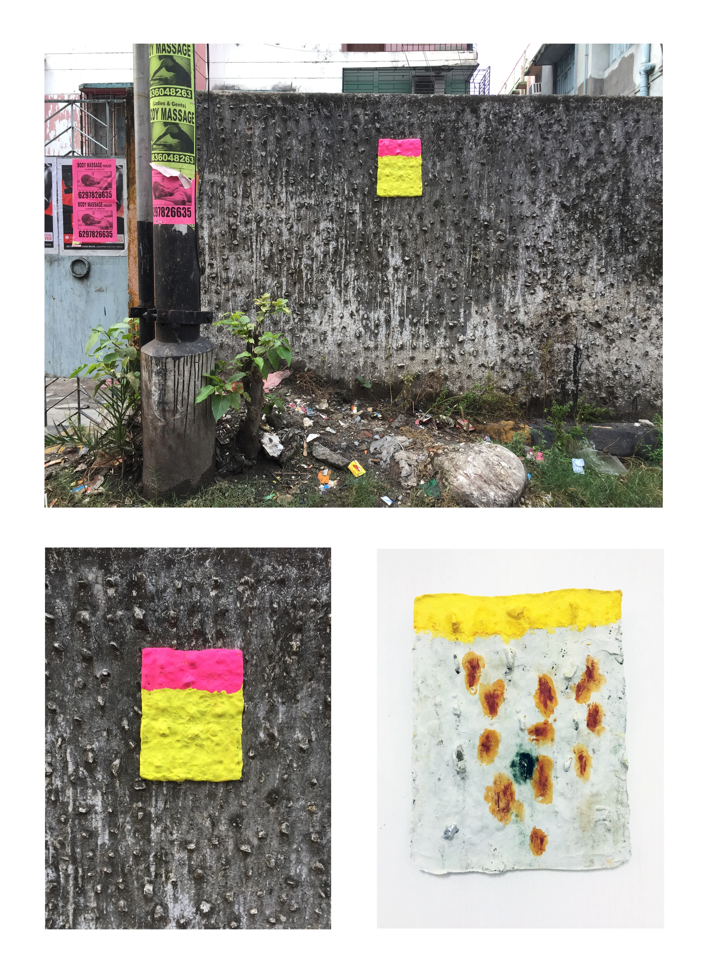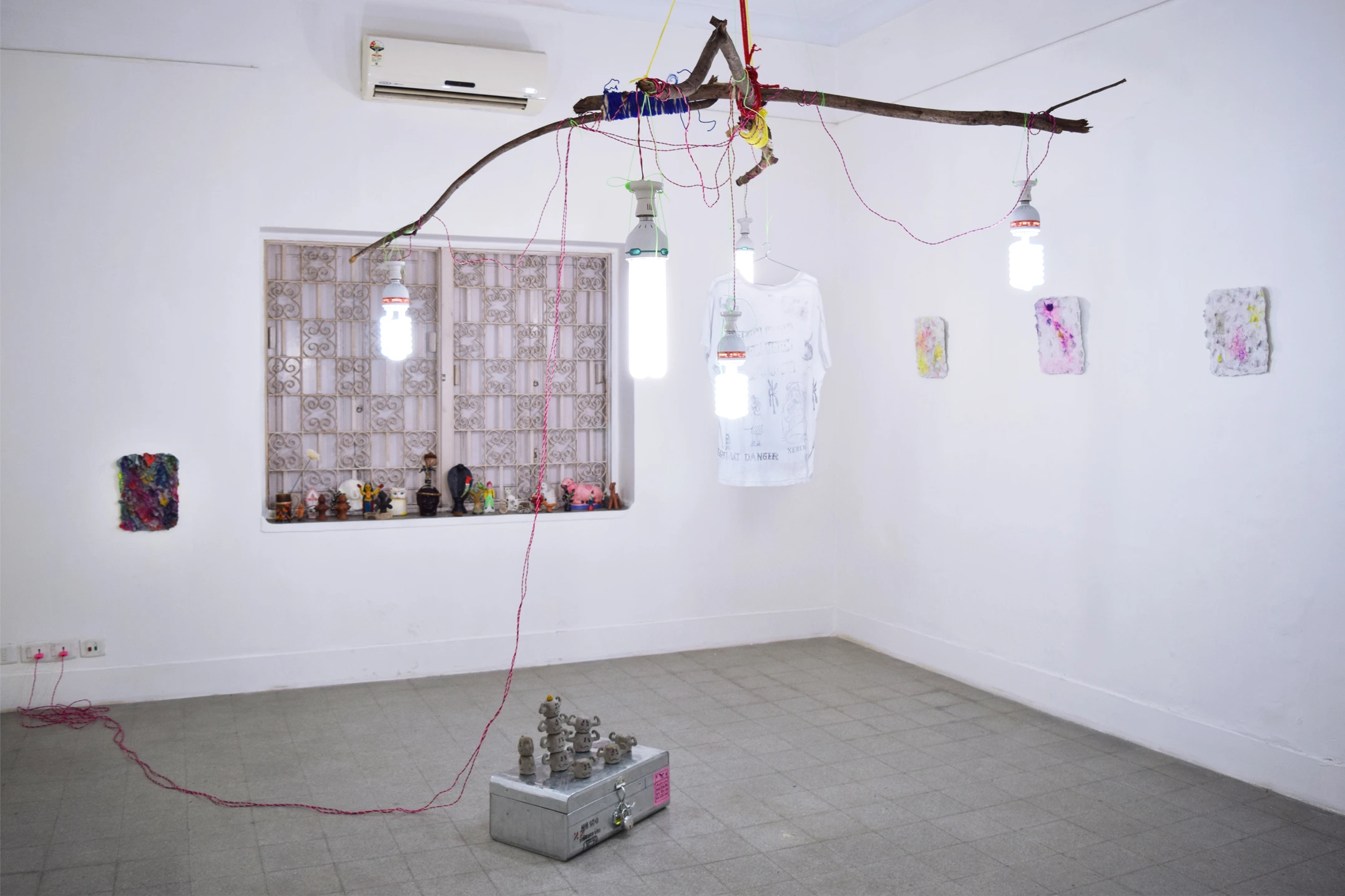 During the whole period in Kolkata I made several casts of the walls in Kolkata and noted their GPS locations, making a sort of map out of them. The walls had stones put into them to prevent people from putting posters on them. In some raw way I found them repellently beautiful and showed them in the exhibition. Later on I made new copies of them when I was back in The Netherlands. Also, I showed a few SUPER and LIFE brick works together with some small clay figures, that where inspired by a potato company logo that was on a jute bag lying around in the streets, saying: INDIAN POTATO HOUSE. The room was lit by a self made chandelier, inspired by the hawkers that sell there merchandise on the streets, with a white shirt as hommage to the working man, where I printed all kinds of graphics on that I encountered during my stay in Kolkata.