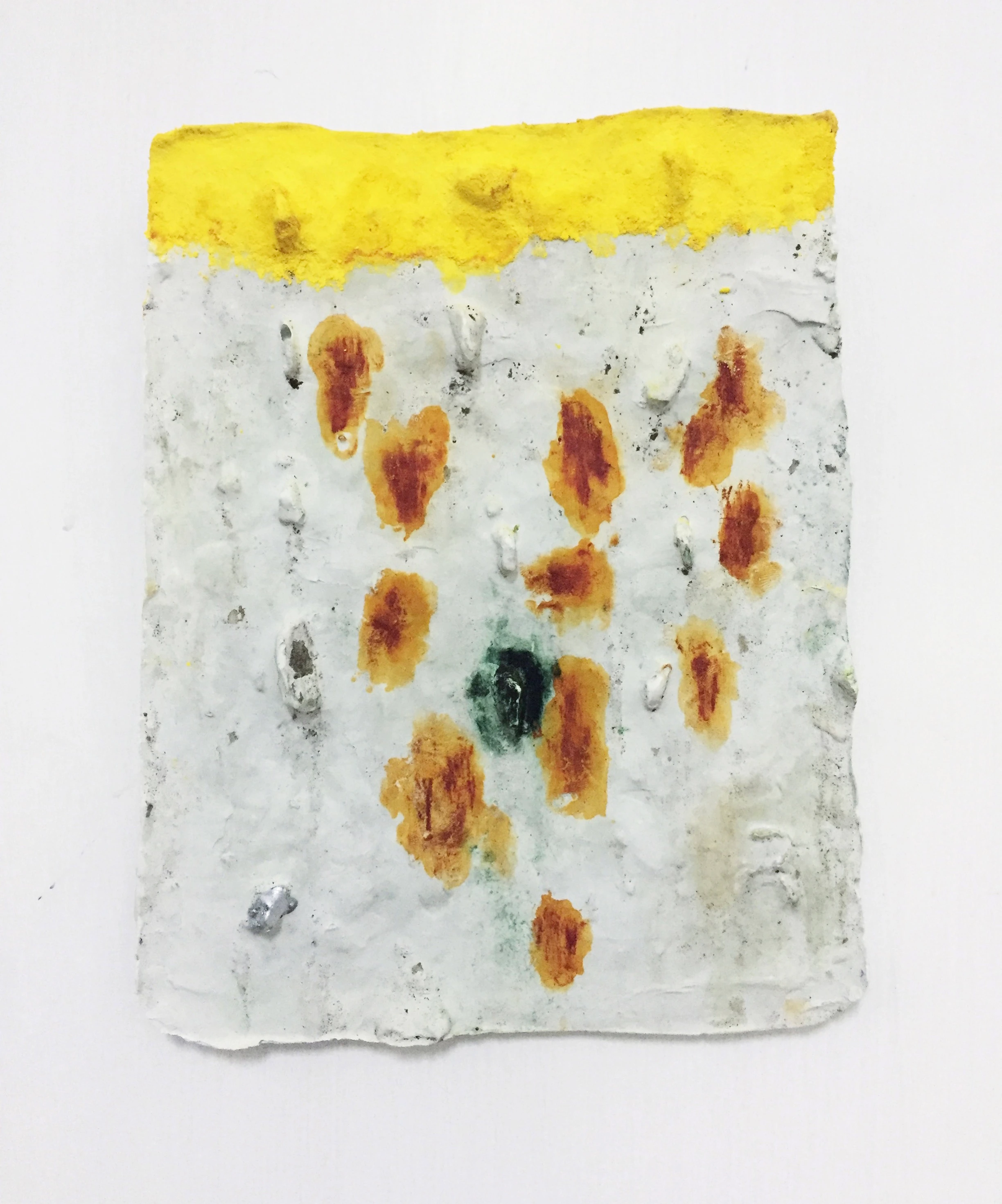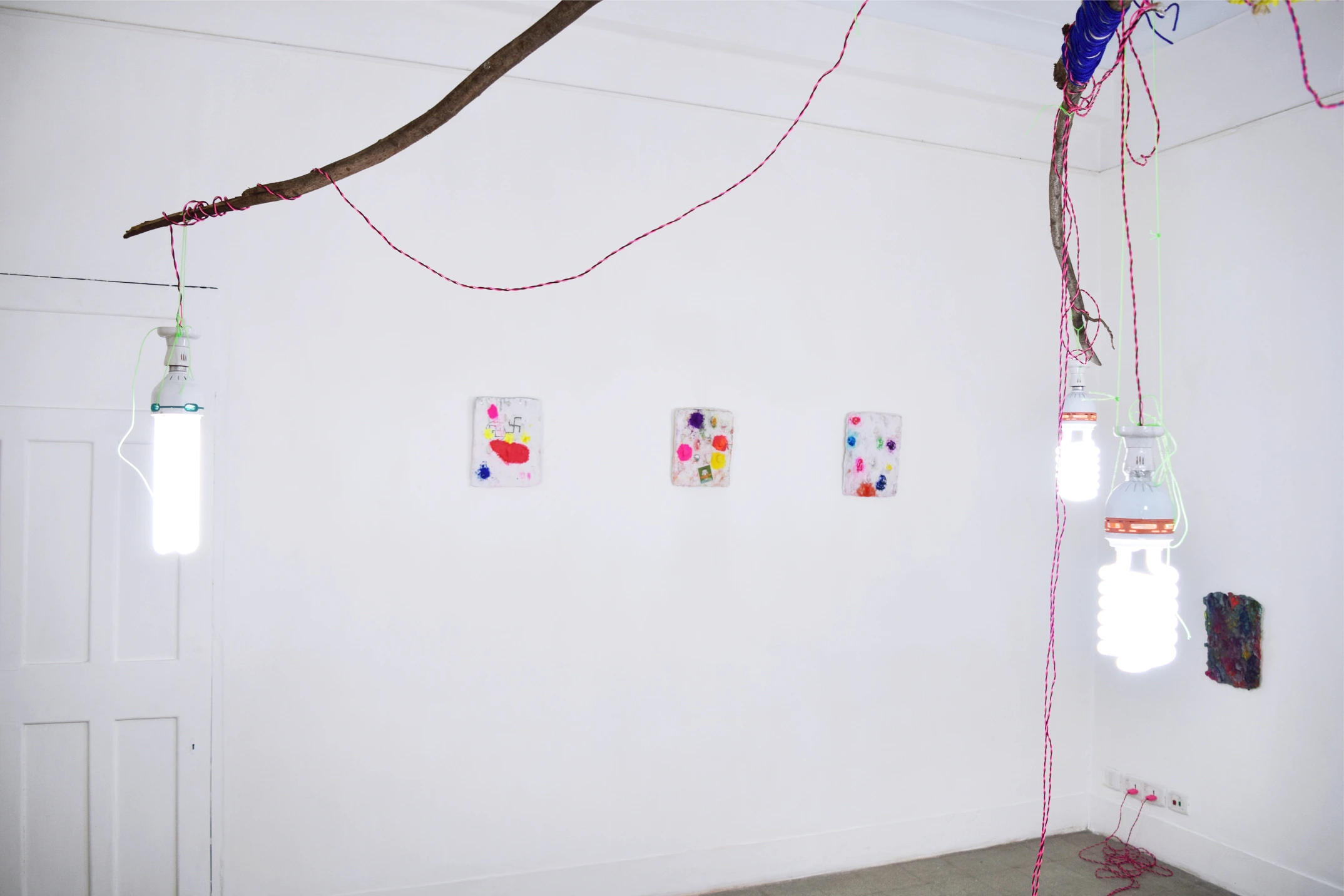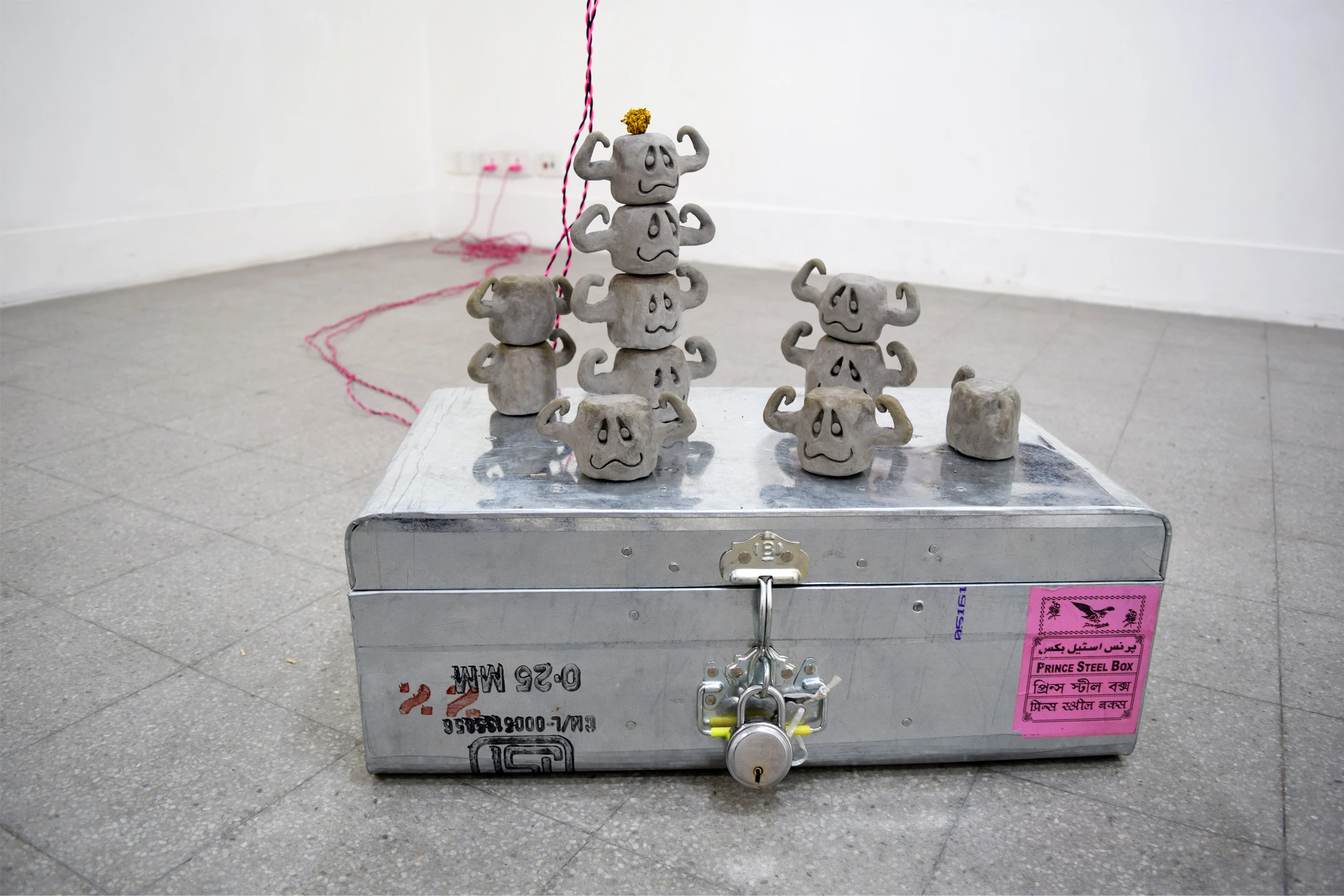 During the whole period in Kolkata I made several casts of the walls in Kolkata and noted their GPS locations, making a sort of map out of them. The walls had stones put into them to prevent people from putting posters on them. In some raw way I found them repellently beautiful and showed them in the exhibition. Later on I made new copies of them when I was back in The Netherlands. Also, I showed a few SUPER and LIFE brick works together with some small clay figures, that where inspired by a potato company logo that was on a jute bag lying around in the streets, saying: INDIAN POTATO HOUSE. The room was lit by a self made chandelier, inspired by the hawkers that sell there merchandise on the streets, with a white shirt as hommage to the working man, where I printed all kinds of graphics on that I encountered during my stay in Kolkata.