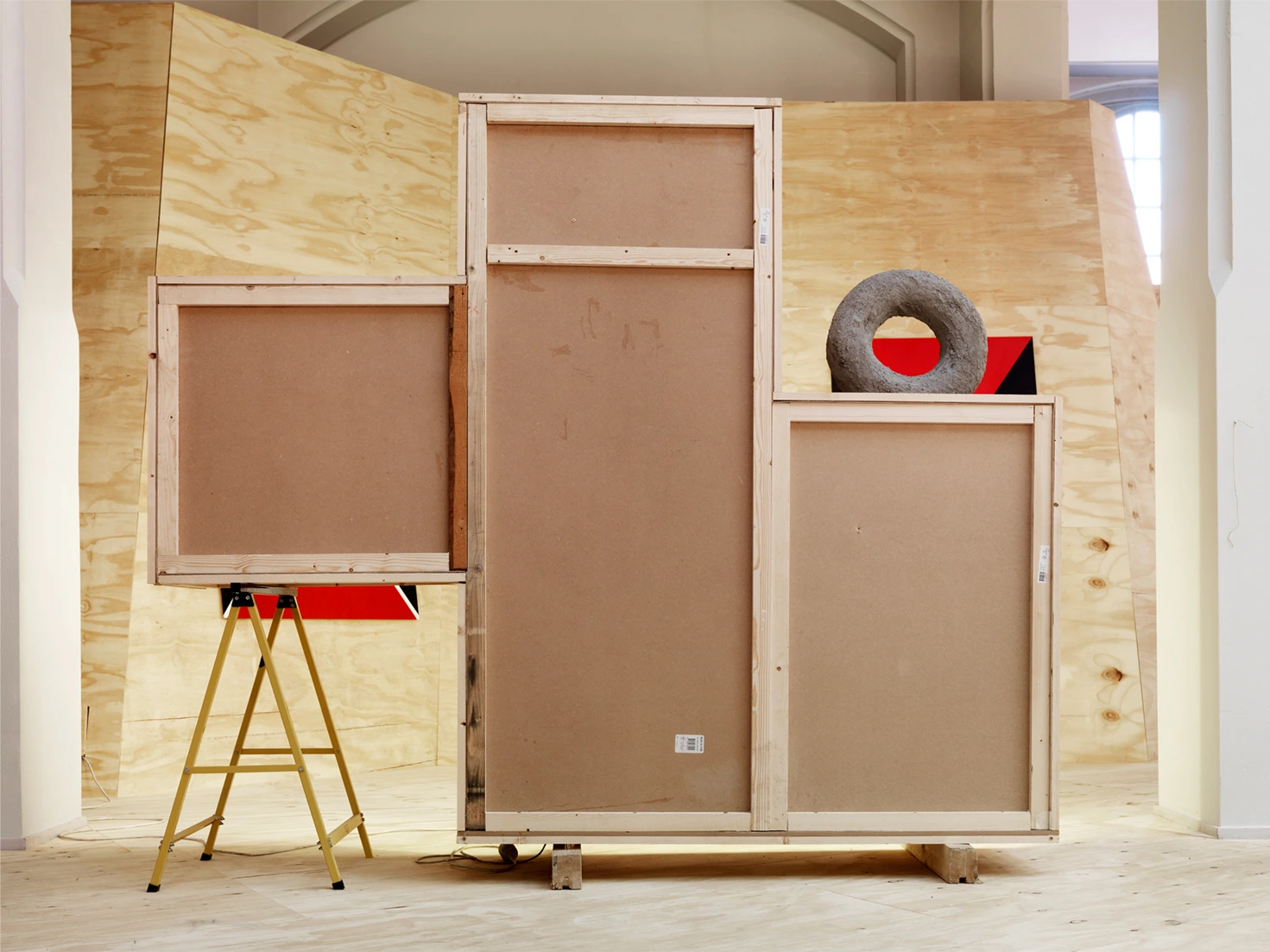 A new temporary public art space in a former post office made of wood, with sloping walls. You can eat and work, read and watch new works made by 43 artists. The paintings, drawings and sculptures hang, stand and lie close to each other, a physical space where the viewer is the link. The exhibition shows extremes made out of a desire, revealing images which can connect us with our future. In the morning and late afternoon the sun shines on the wood and the artworks from different sides. The potato walls create a utopian earthly place for you in the former post office of Groningen.