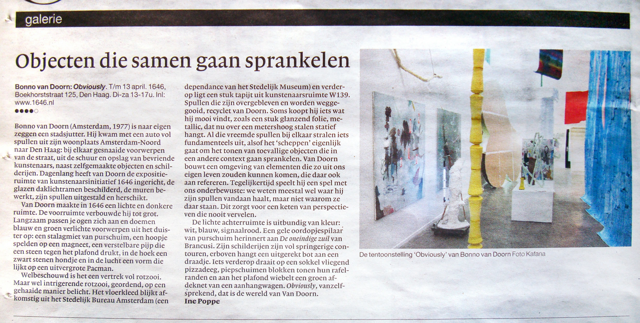 In this solo exhibition 1646 is filled with debris and traces of a whirlwind that Bonno van Doorn left behind. Some materials that occupy the room seem to have ended up here by accident, or appear to have casually come into existence as some sort of by-product. Others look like attempts at an object with a proper identity but that were never quite realised. In the end everything escapes identification. Each item is a fragment, provisional, pointing elsewhere. Walking around this environment one encounters the constant surprise of a failed recognition.