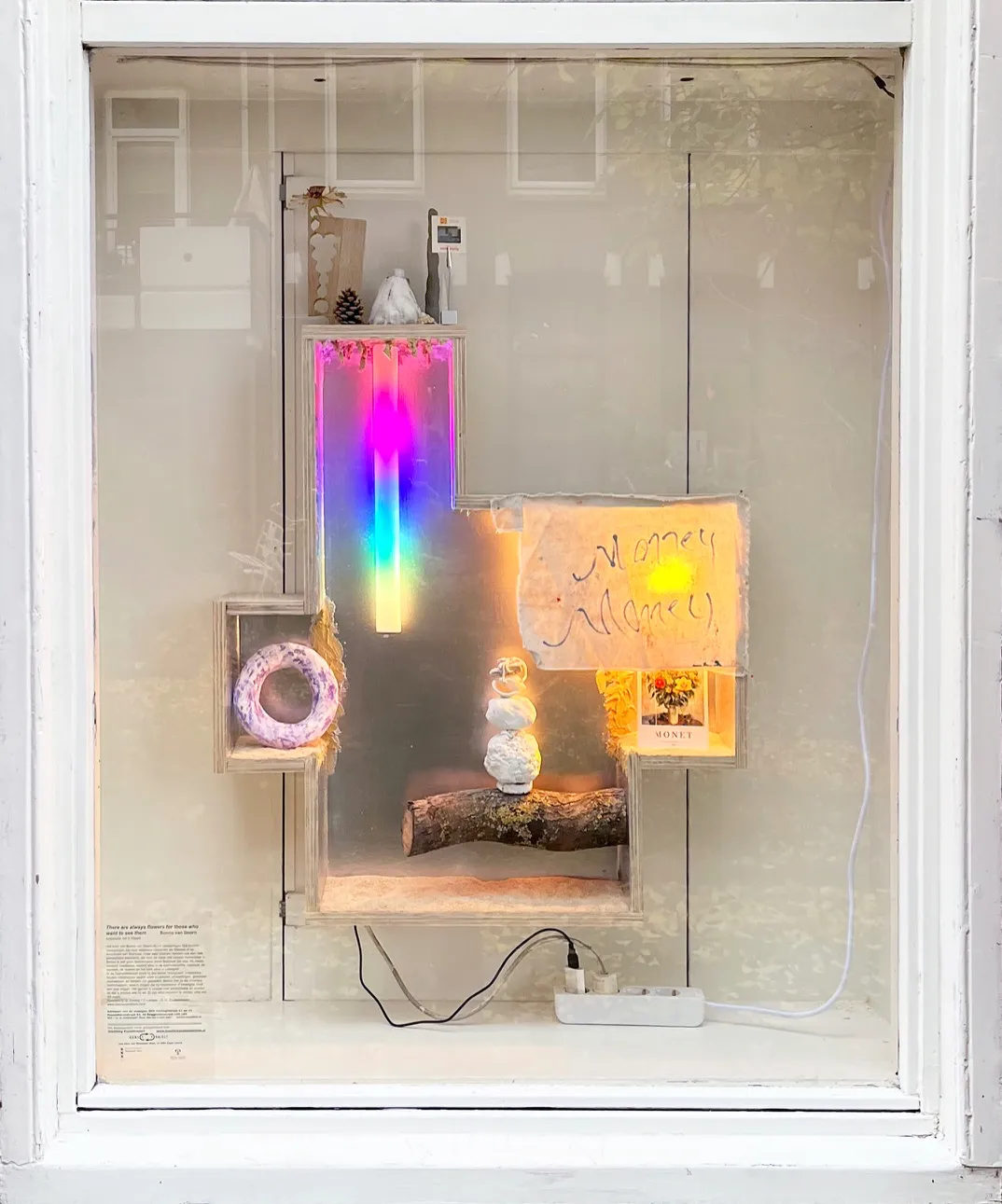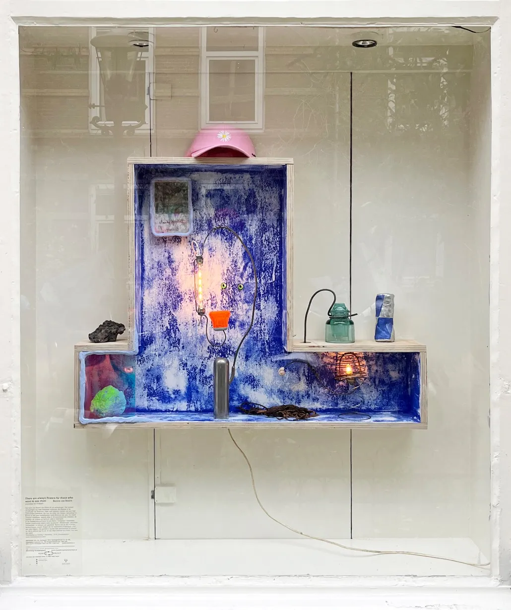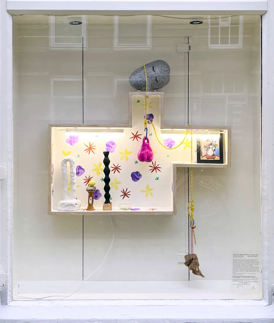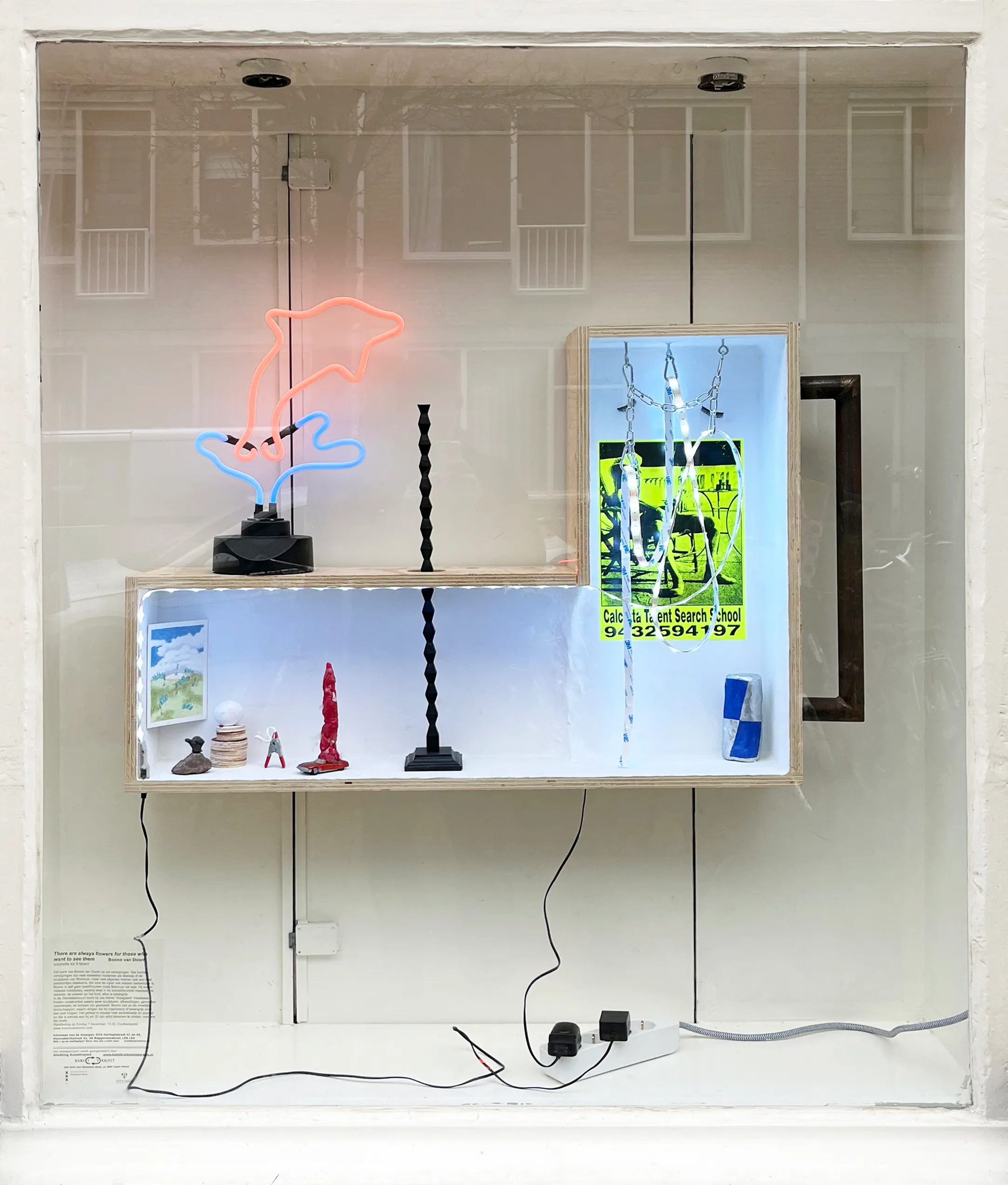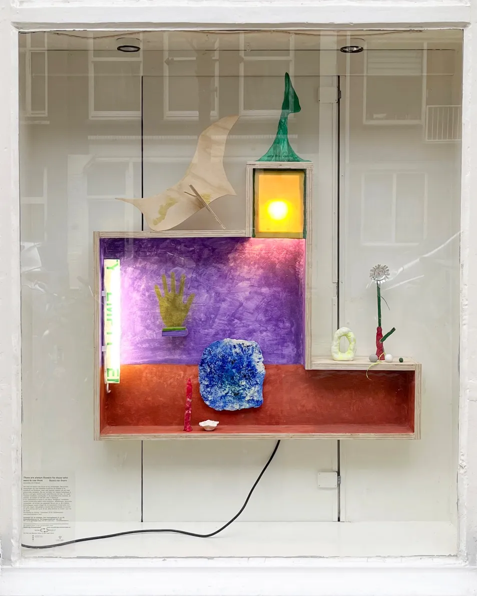 Bonno van Doorn's work is full of references. These can be references to classical modernists like Matisse or the sculptures of Brancusi, but many objects also have a very personal meaning that isn't immediately recognizable to the viewer. Bonno himself isn't a sculptor like Brancusi. He usually creates installations in which everything in the exhibition space contributes: the walls, the floors, and the lighting: everything is important. In the shop windows in the Zeeheldenbuurt neighborhood, he exhibits six small "portable" installations: wooden structures that contain sculptures, images, found objects, and lamps. Bonno sees them as inner landscapes, where things he finds inspiring or important are given a place. The whole is visually very appealing and positive, which is exactly what he wants. There are always flowers for those who want to see them.